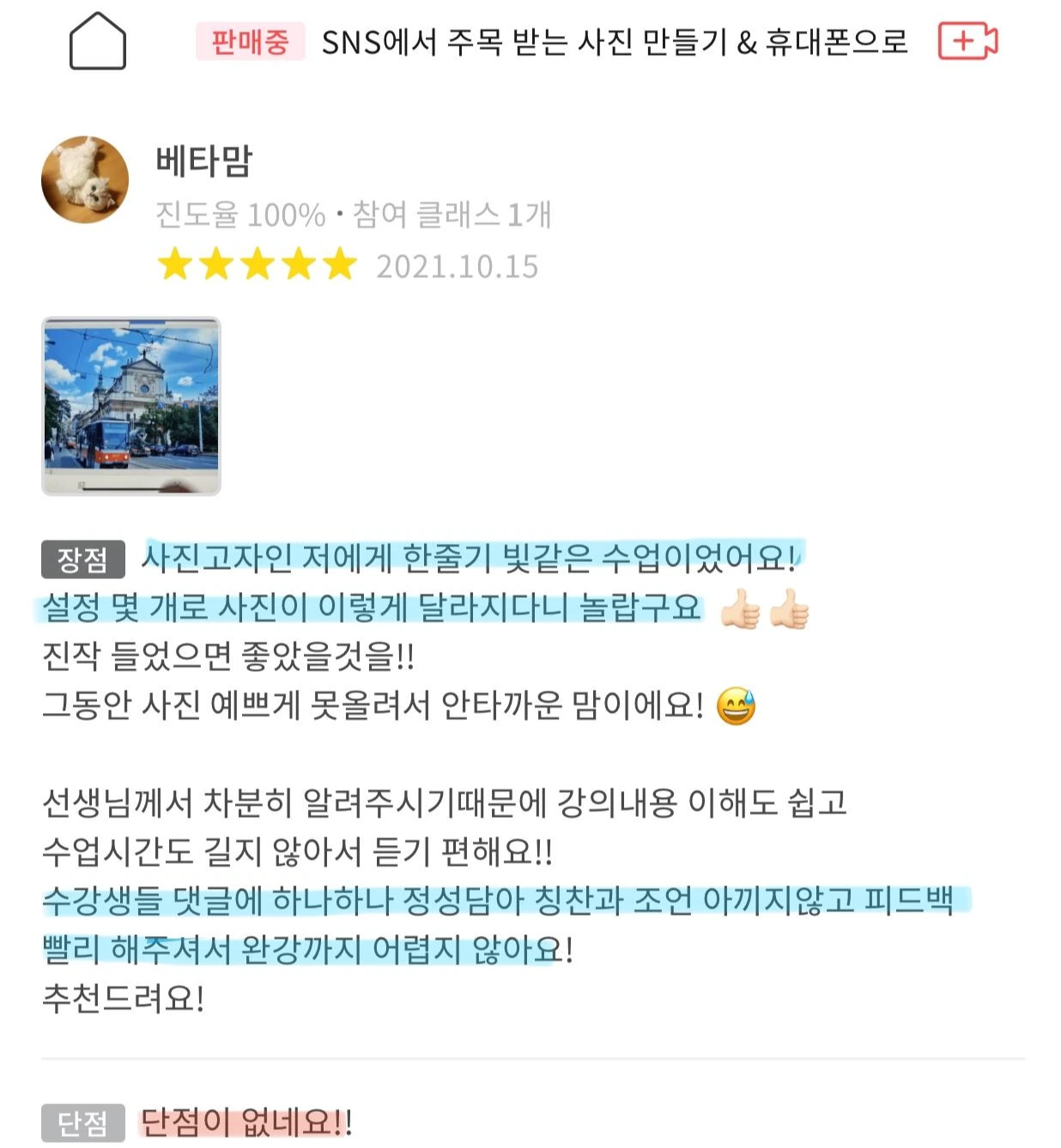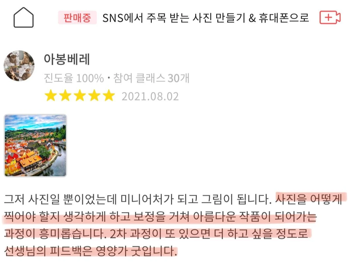수강생에게 칭찬을 많이 합니다. 사진 보정 후 격려의 댓글을 달면 많이 좋아하십니다. 누군가에게 인정받는 기분은 역시 좋습니다. 물론, 냉정한 비판도 합니다. 이유 없는 칭찬도 안 합니다. 처음보다 보정 실력이 많이 발전하신 분들도 있습니다. 이유는 역시 꾸준함입니다. 모든 강의를 다시 듣고 미션도 여러번 반복해서 하신 수강생들은 분명 성장해서 졸업하십니다.