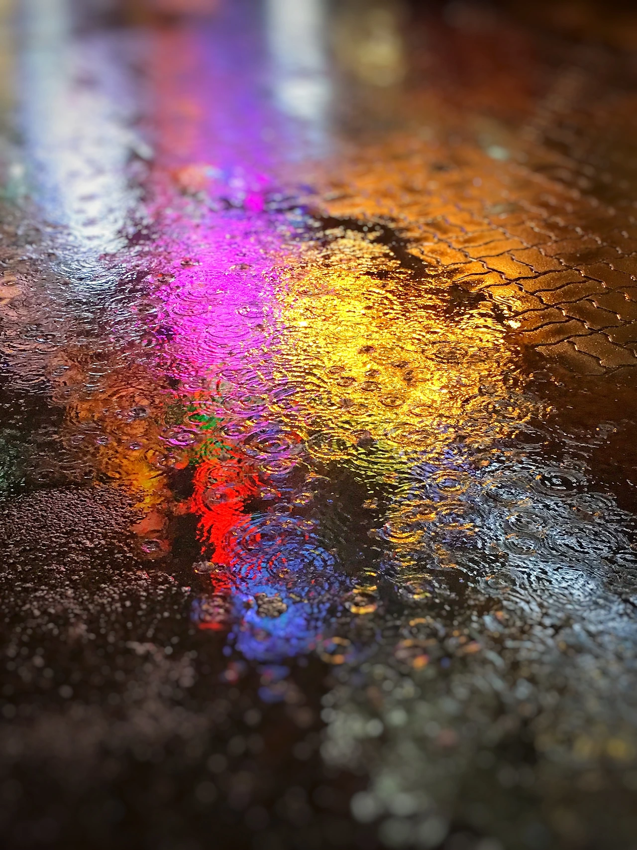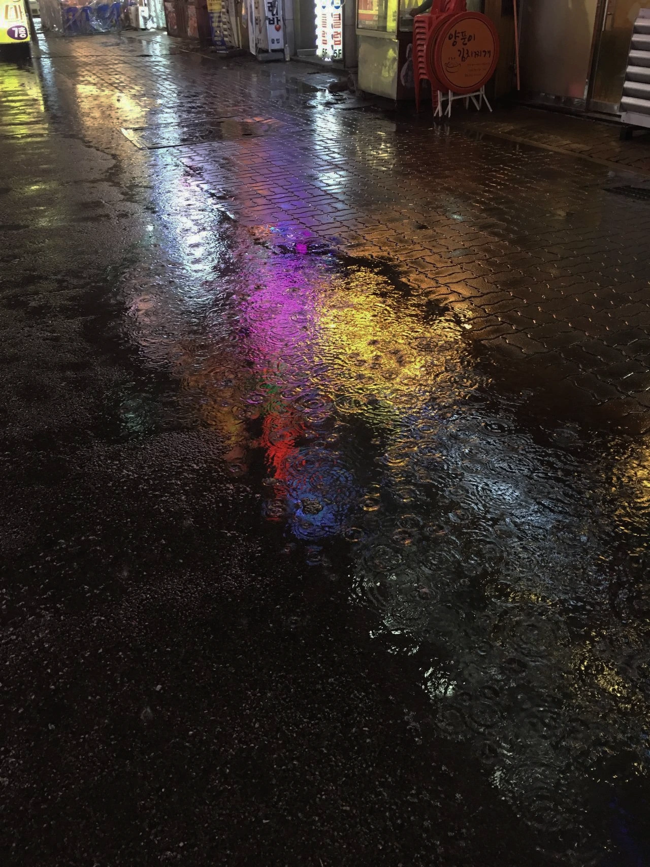집에서 천천히 사진을 보면서 밝기와 채도를 보정할 때, 사진 안에 있는 특별한 부분이 보였습니다. 숨은 그림을 찾았습니다. 고인 빗물에 비친 불빛이 담겨있습니다. 빗물이 고인 부분에 빗방울이 튀면서 물감으로 그린 수채화 같았습니다.