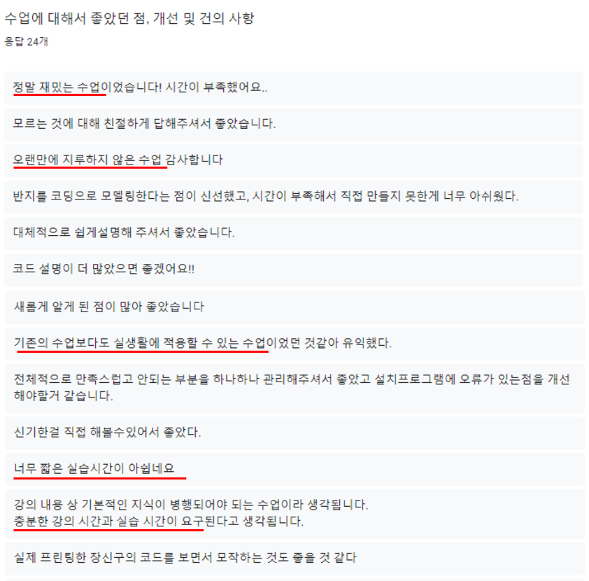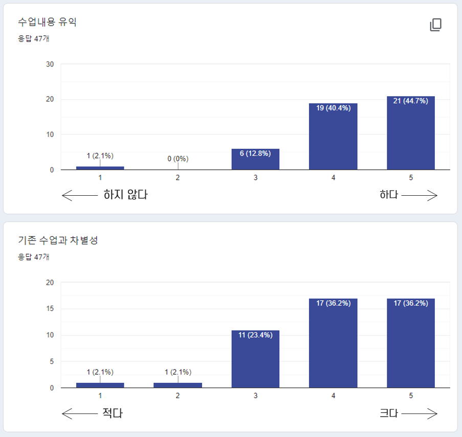 강의 평가를 받았습니다.평가가 주옥같습니다. 작성한 학생 중 80%가 유익하다, 기존 수업과 차별성이 크다고 적어줬습니다.