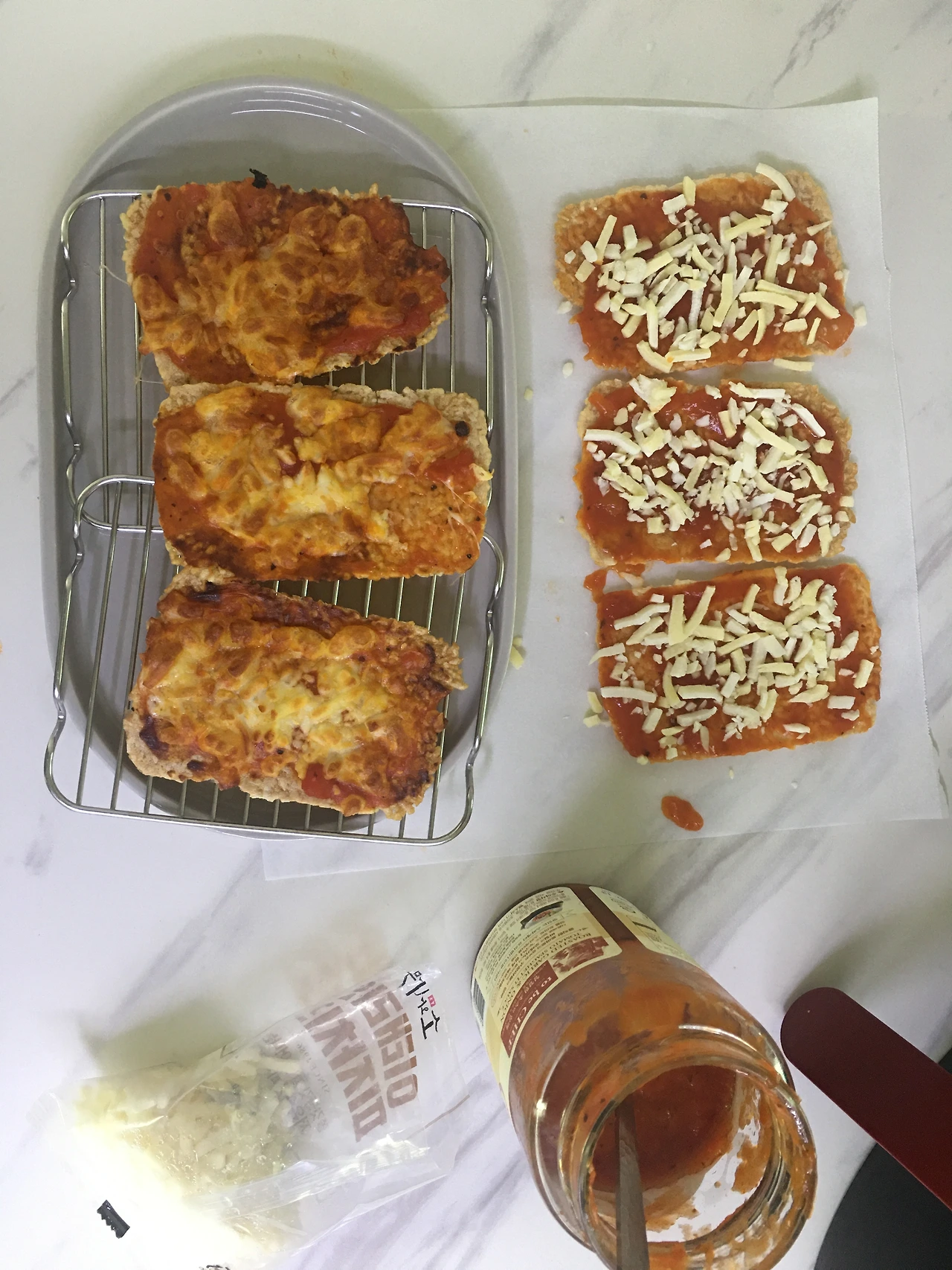 누룽지 위에 스파게티 소스를 푸짐하게 발라줍니다. 치즈도 푸짐하게 뿌려줍니다. 에어 프라이기에 5분 돌려줍니다. 맛있게 먹습니다. 참 쉽죠. 어른은 핫 소스 뿌려 먹으면 더 맛있습니다.