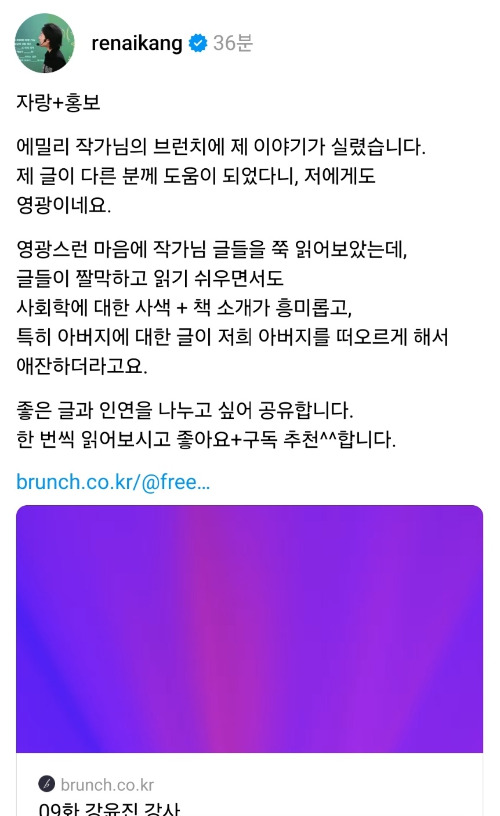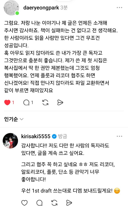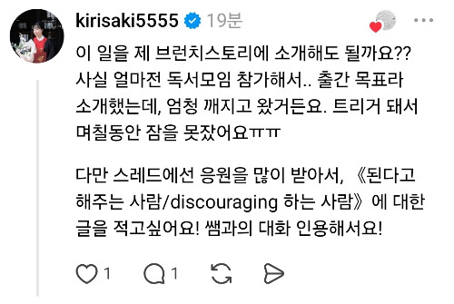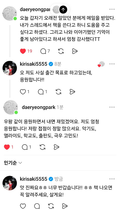 반대로, 온라인 커뮤니티 ‘스레드’에서 만난 분들은 제 출간 계획을 진심으로 지지해 주셨습니다. 강윤진 강사님과 박대령 임상심리사님을 비롯해, 많은 분들이 제 글을 세심하게 읽고 응원해 주셨습니다.