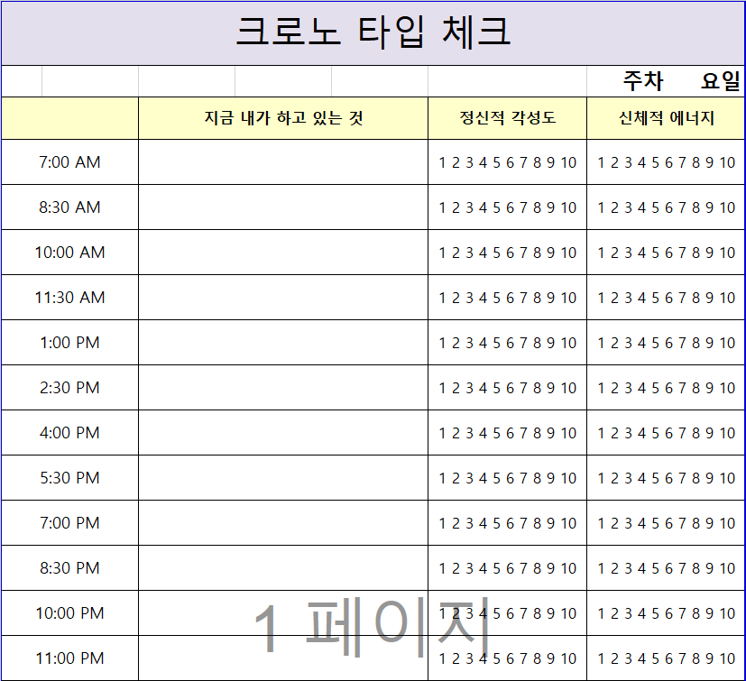 한번 자신의 에너지패턴을 파악하고 싶으시다면 아래 링크에서 양식지를 다운받아 2주 정도 자신의 에너지 패턴을 기록해보시고 통계를 내보시길 추천드립니다.