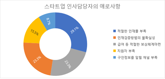 인사담당자는 채용단계에서 ‘채용을 위한 적절한 인재 pool 부족’(29.1%)을 가장 큰 애로사항으로 꼽았습니다. 특히 가장 채용수요가 큰 개발직의 경우 인재 pool 확보와 접근에 더욱 어려움을 느끼고 있는 것으로 나타났습니다. 이밖에도 인재검증방법이 불확실하다는 것과 구인정보를 알릴 채용 채널이 부족하다는 점을 애로사항으로 꼽았습니다.