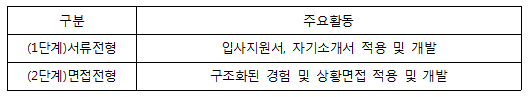 서류전형은 지원자가 제출한 입사지원서, 자기소개서를 평가하여 조직 및 직무에 적합한 인재를 선발하는 과정입니다. 면접전형은 면접관이 지원자에게 질의하거나 지원자의 발표와 토론을 관찰하여 조직 및 직무적합성을 평가하는 과정으로서 면접에서는 심층적인 질의응답 또는 면접관과의 상호작용을 통하여 직무수행에 필요한 능력을 검증합니다.