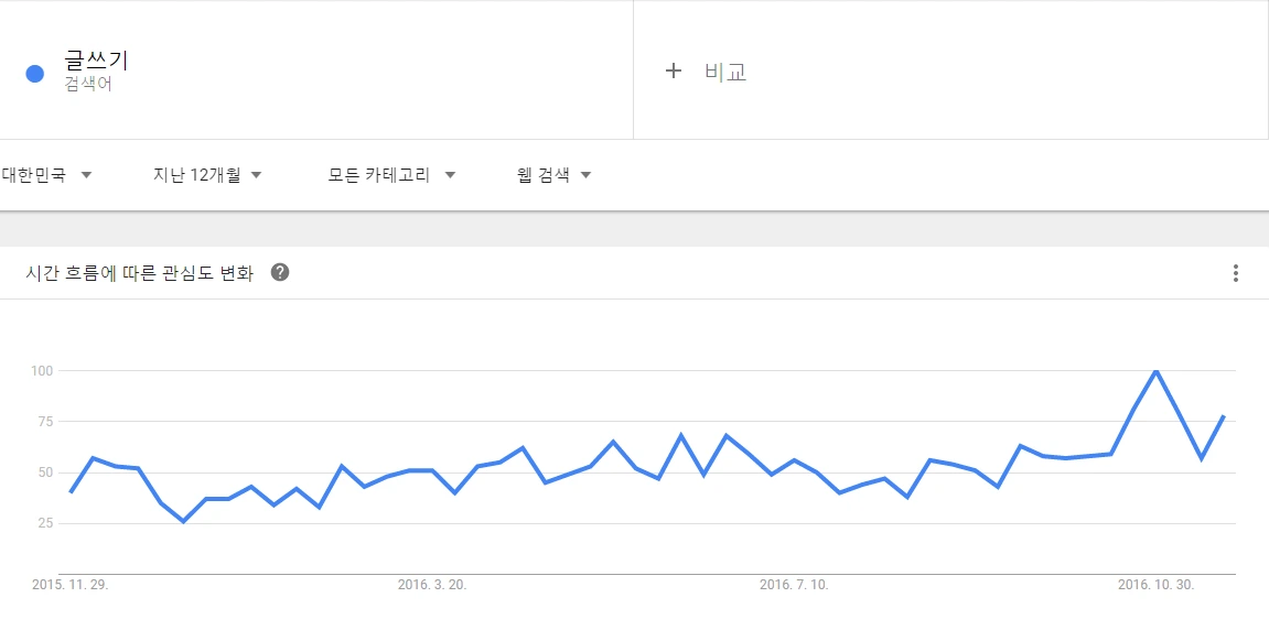 위 그래프는 구글 트렌드로 살펴본 '글쓰기' 키워드의 검색 트렌드입니다. 글쓰기에 대한 사람들의 관심은 꾸준히 일정 수준을 유지하고 있습니다. 최근에는 그 관심도가 급증하기도 했습니다.