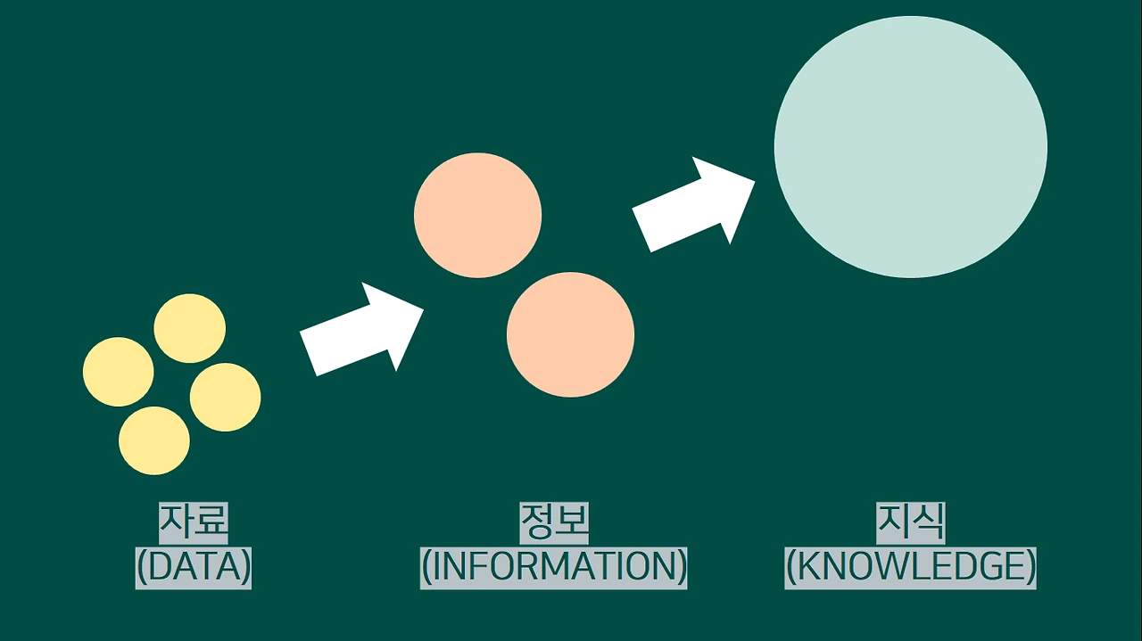 그렇다면 지식은 어떻게 만들어질까요? 수많은 자료(Data)를 관련된 것들끼리 연결하고, 의미를 부여하면 정보(Information)가 됩니다. 그리고 이 정보들을 하나의 논리에 따라 연결하면 지식(Knowledge)이 됩니다.