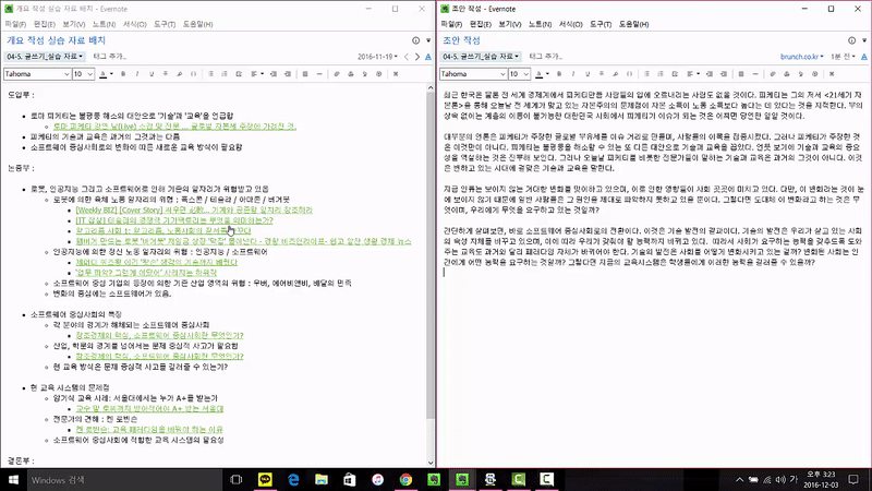 특히 에버노트의 '노트 링크' 기능은 글쓰기의 효율성을 배로 높여줍니다. 노트 링크란 특정 노트의 링크를 복사해서 붙여넣으면, 해당 링크를 클릭했을 때, 바로 이동할 수 있게 하는 기능입니다. 아래 이미지처럼 개요 노트와 글쓰기 노트를 동시에 열어놓고, 해당 자료를 확인해야 할 때, 링크만 클릭하면 바로 이동할 수 있습니다. 별것 아닌 것 같지만, 글을 쓸 때 자료를 관리하는 것이 은근히 많은 시간을 소비하는 작업이라, 이 시간을 줄이는 것만으로도 상당한 양의 시간과 에너지를 줄일 수 있습니다.