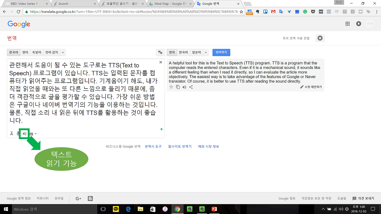 내 목소리로 직접 읽어본 뒤에는 다른 사람의 목소리로 다시 들어보는 것도 큰 도움이 됩니다. 관련해서 활용할 수 있는 도구로는 TTS(Text to Speech) 프로그램이 있습니다. 입력된 문자를 컴퓨터가 읽어주는 프로그램입니다. TTS로 텍스트를 읽게 되면 기계음의 느낌이 들긴 하지만, 다른 사람의 목소리로 내 글을 들으면, 내가 읽을 때 인지하지 못했던 부분을 잡아낼 수도 있습니다. 가장 쉬운 방법은 구글이나 네이버 번역기의 기능을 이용하는 것입니다.