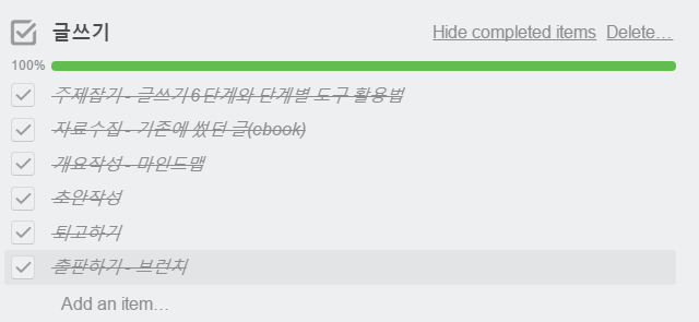 이상으로 글쓰기 6단계와 단계별로 효율성을 높여주는 도구들에 대해서 알아보았습니다. 위의 6단계를 의식적으로 글쓰기에 적용해보면, 이전보다 체계적으로 글쓰기가 이루어짐은 물론, 글쓰기 시간도 확실히 단축될 것입니다. 아래와 같이 체크 리스트를 만들어 진행하는 것도 큰 도움이 됩니다.