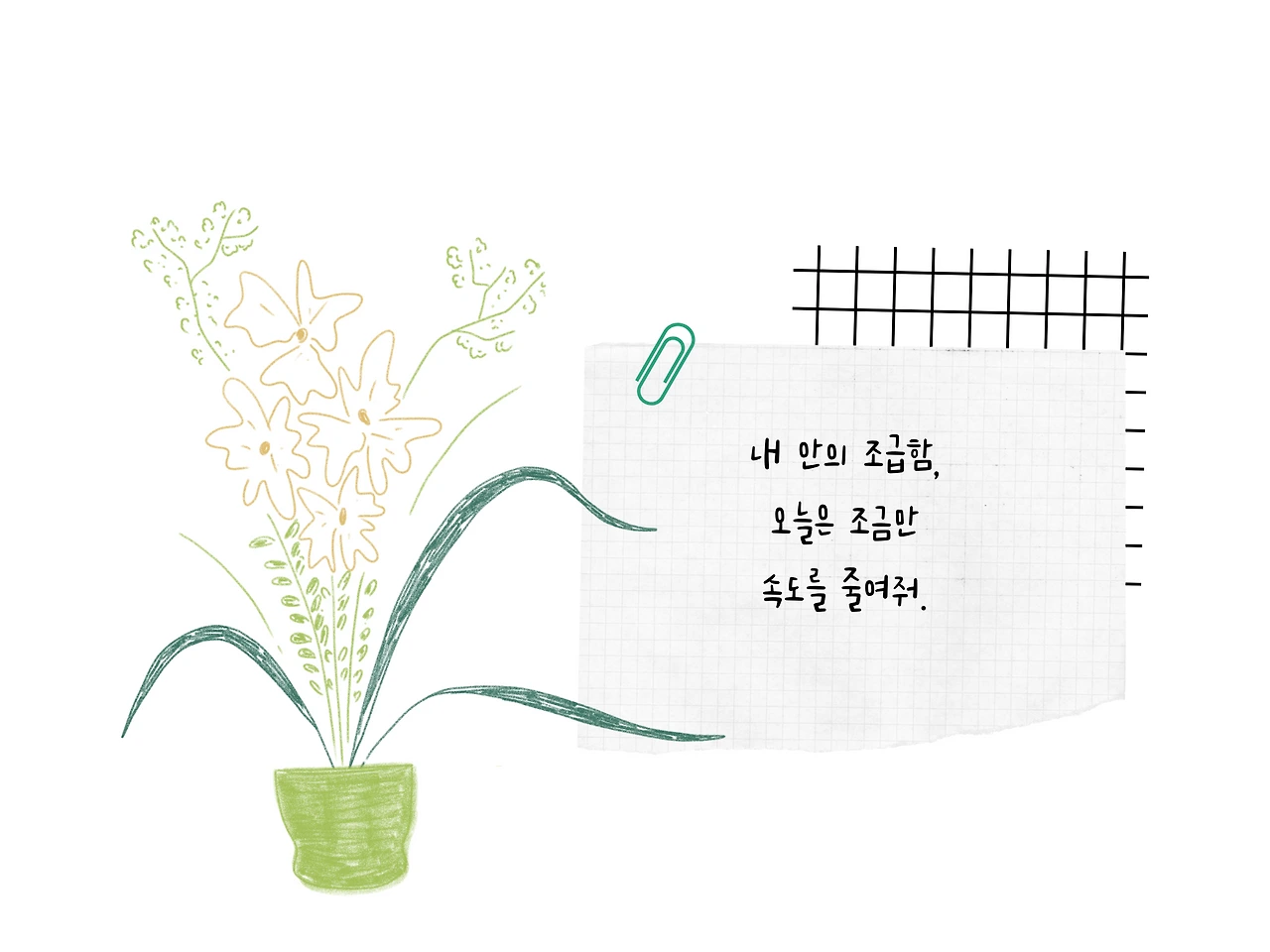 여러분의 마음에도 혹시 조급함 한 줄 느껴지나요? 오늘의 조급함에도 토닥토닥, 잘 다독이며 나아가봐요:)