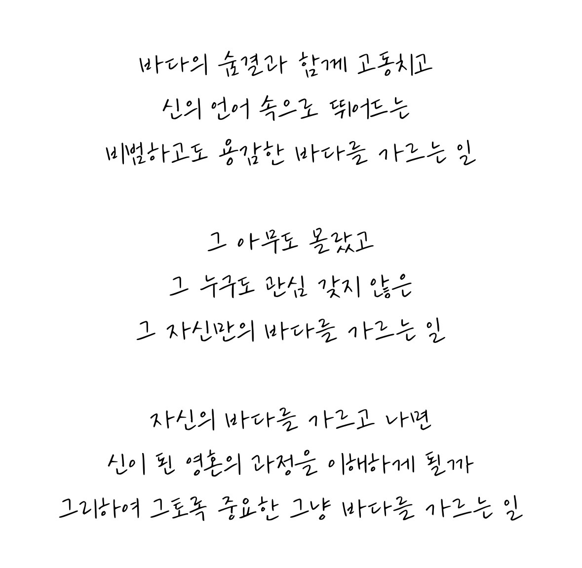 만약 사랑이 있다면 그런 모양일 것 같았다. 그리고 사랑은 신의 본체를 닮았을 것 같았다. 외로움 속에 고요한 신의 소리 깃든다. 외로워 본 존재만이 그 소리 귀히 듣는다. 그래서 이제 나는 전처럼 외로움을 싫어하지 않는다.