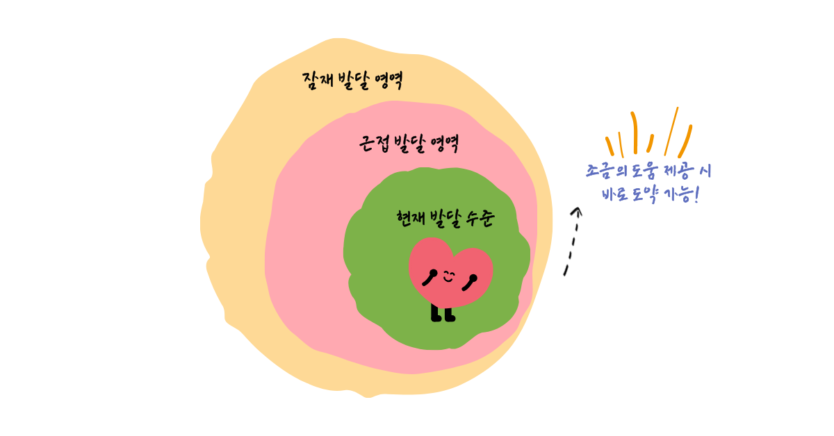 그중 근접발달영역(Zone of Proximal Development)은 ‘도움을 받으면 성취할 수 있는 잠재 능력 영역’으로, 중재 목표 설정 시 가장 핵심적인 지표가 된다. 아동이 이미 완벽히 아는 어휘나 아예 생소한 어휘가 아니라, 주변에서 조금만 도와주면 바로 습득할 수 있는 한 끗 영역을 찾아내 계획을 세우는 것이다.