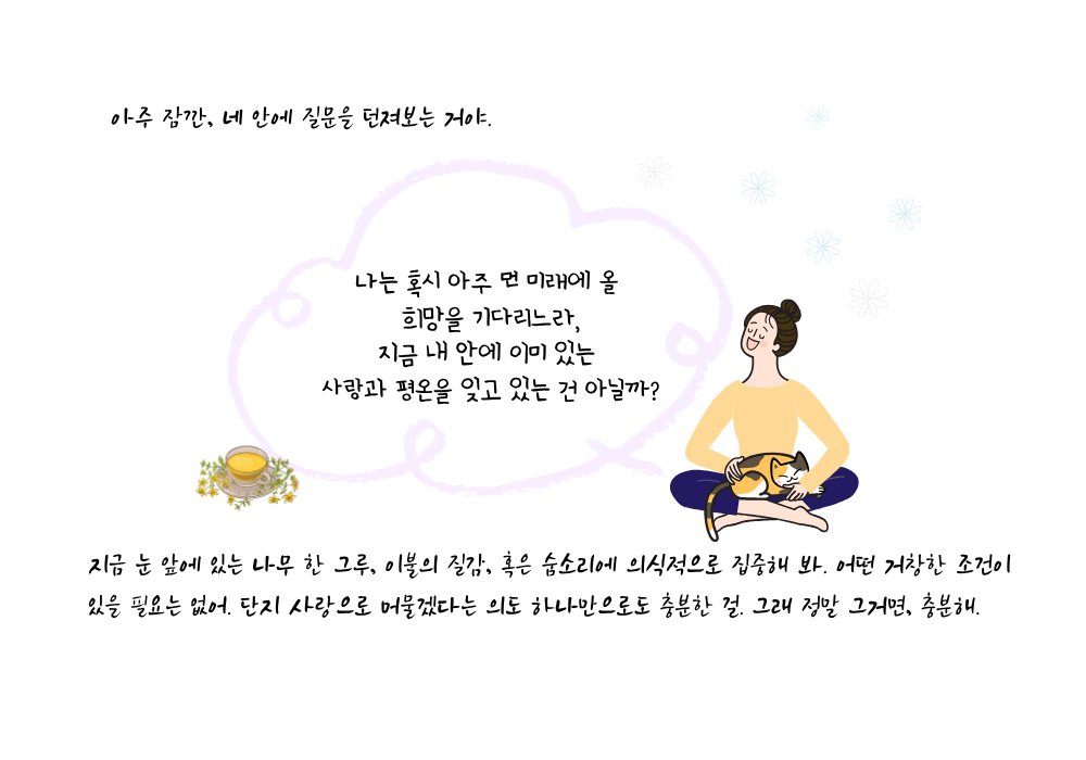 아, 그건 멀리 있는 게 아니었구나. 내가 지금에 의식을 두고 집중한다면, 내 일상의 가치를 마음으로부터 충분히 느껴준다면, 사랑이 나에게 들어오도록 허락해 준다면, 단지 그것을 한다면 내 마음이 비로소 자연스레 치유될 수밖에 없는 것이구나.