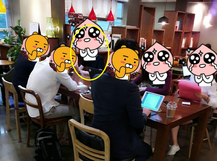 2016년 9월 30일 신논현 한 카페에서 '잘노공'의 첫 스터디. 스터디 내내 휴대전화만 보다가 모임원들의 번호를 따더니 스터디가 종료되기도 전에 떠난 어설픈 날파리.(노란 원)