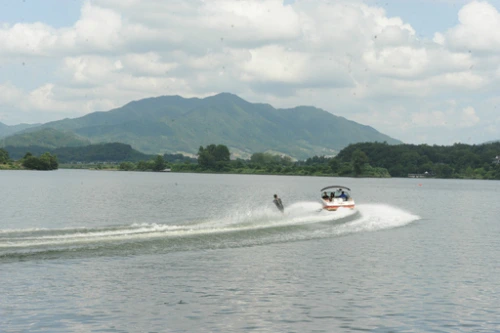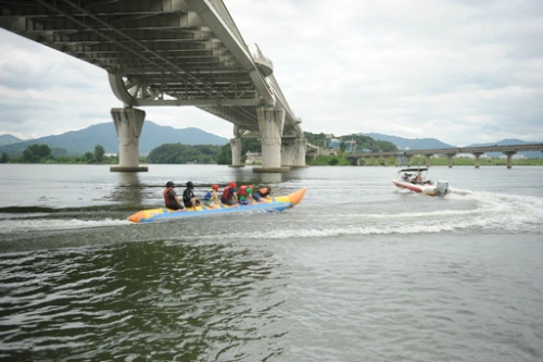 여행객들이 충주 남한강에서 바나나보트를 타고 있다.
