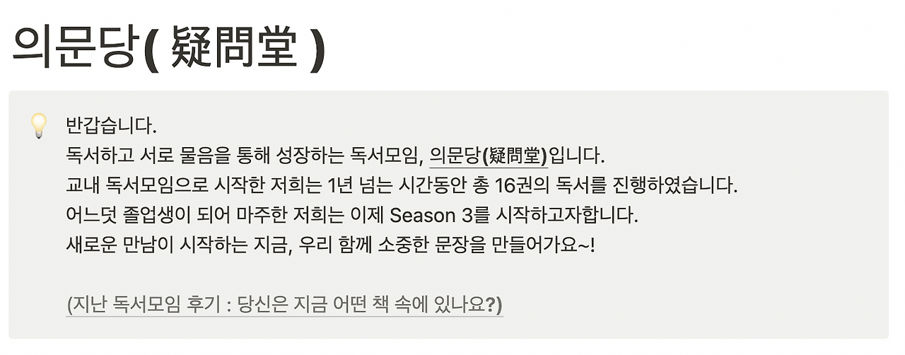 최근에는 기존 멤버의 부탁으로 의문당 독서모임도 다시 시작하였다. 학창 시절 1년 넘게 운영해온 독서모임인데, 어느덧 직장인이 되어 다시 만나게 되었다. 정말 감회가 새롭다. 이번에는 직군을 좀 더 넓혔으며, 참여한 멤버는 금융, 컨설팅, HR, 무대기획, 스타트업 등 정말 다양한 사람들이 모였다. 이들과 함께하는 이야기가 앞으로도 많이 기대된다. 노션링크를 공유드리니, 편하게 놀러 와주세요 :)