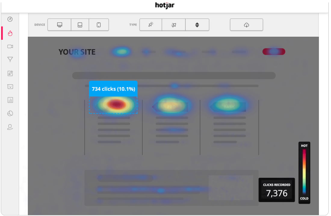 Hotjar 세션 기록을 통해 각 요소를 볼 수 있다. 사용자가 각 요소에 어떻게 반응하고, 상호 작용하는지 또는 예고 없이 떠나는지 알 수 있다. 메뉴 영역, 연락처 정보, 거래, CTA 단추와 같은 주요 페이지 요소를 확대하여 사용자가 실제로 이에 어떻게 반응하는지 확인한다.