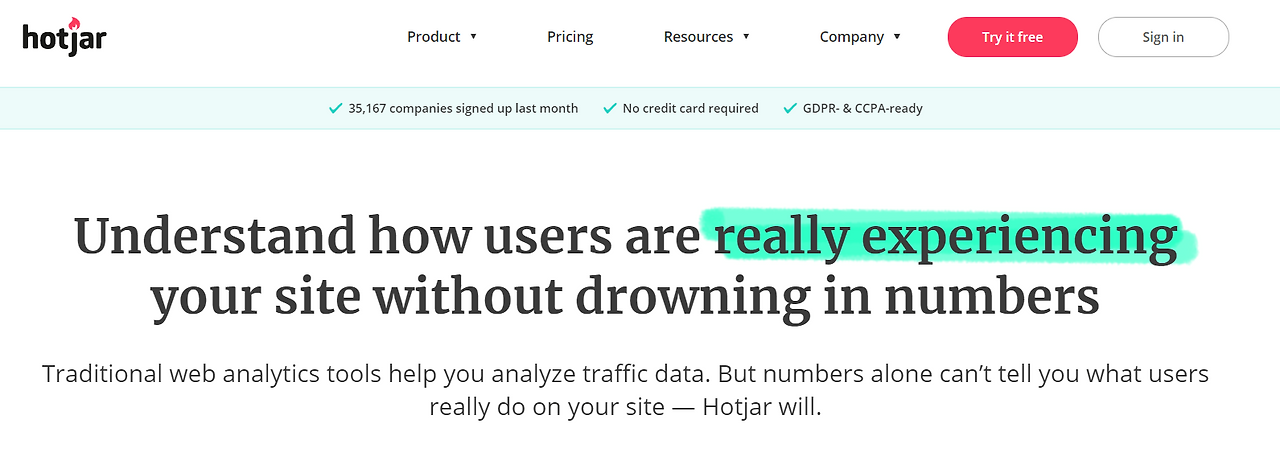 핫자(Hotjar)는 유저의 정성분석에 대해 최적화된 솔루션이며 전 세계에서 가장 많이 사용하는 웹사이트 사용자경험 정성분석 도구 중 하나이다. 핫자가 제공하는 가장 강력한 툴은 바로 Recording과 Heatmap이다. Heatmap을 통해 유저들이 우리 웹사이트에서 어느 부분을 가장 많이 클릭하였는지 알 수 있다. 더 나아가 Recording을 통해 이렇게 클릭하기 까지 유저들의 마우스 커서 움직임과 클릭된 페이지를 함께 관찰함으로써 유저들이 서비스를 이용하는 구체적인 User-flow를 파악할 수 있다.