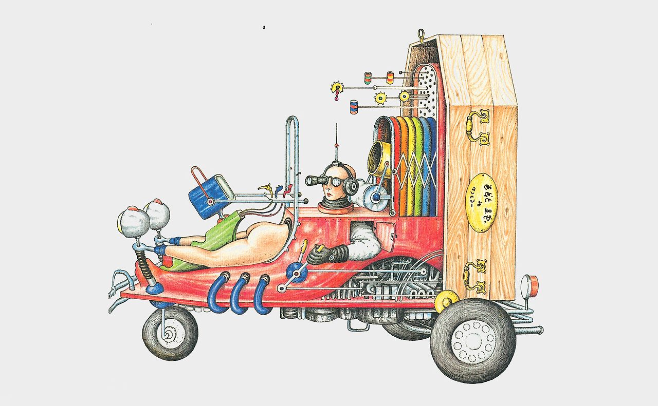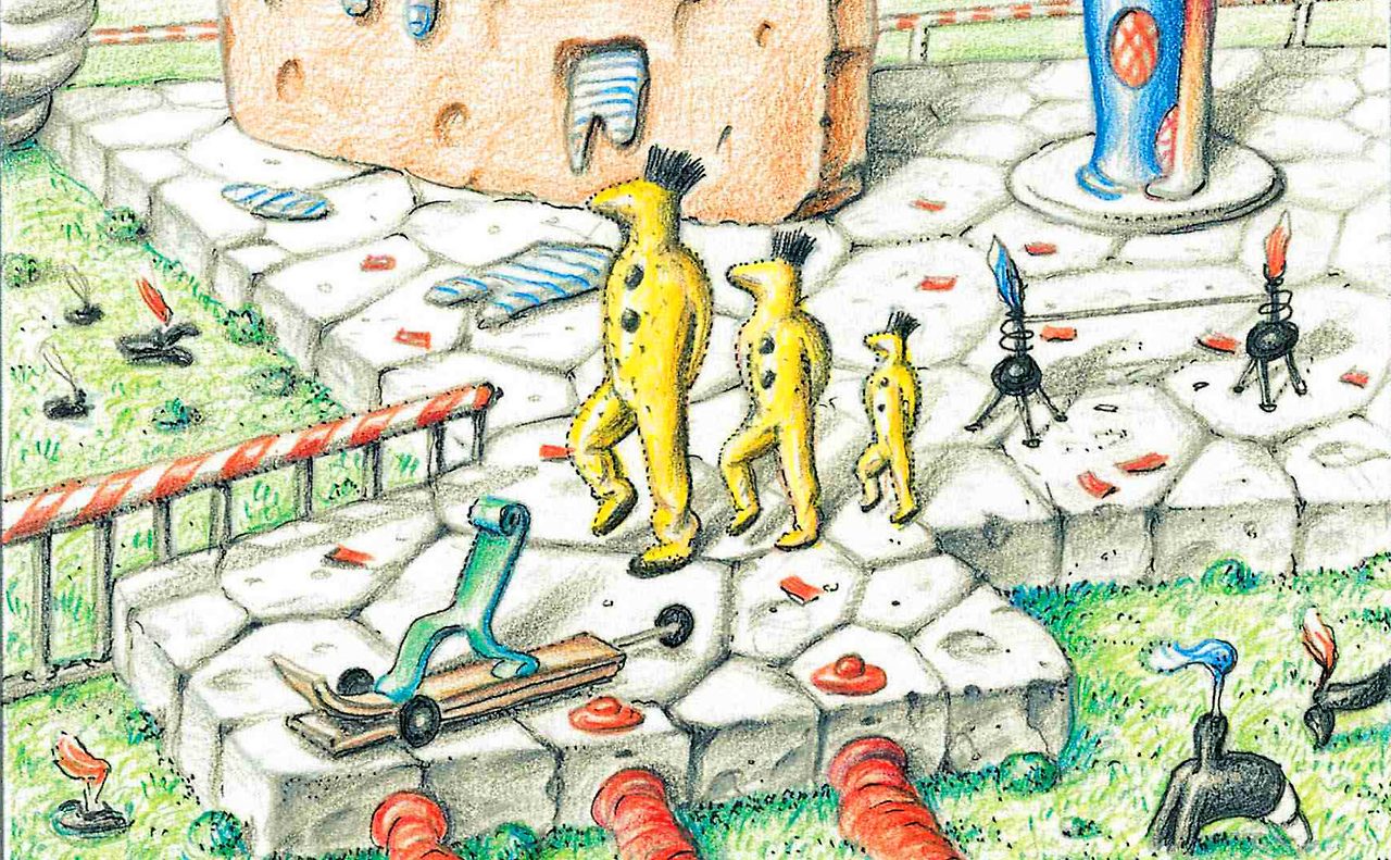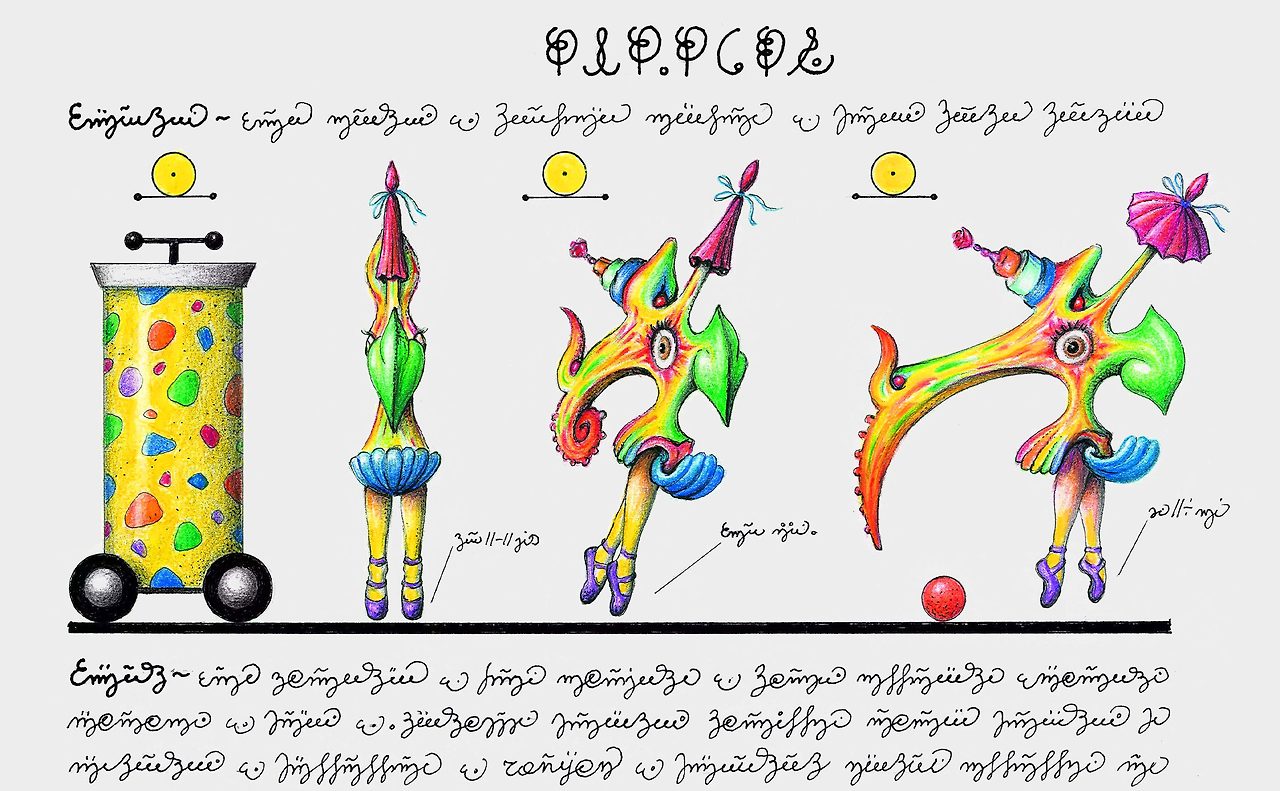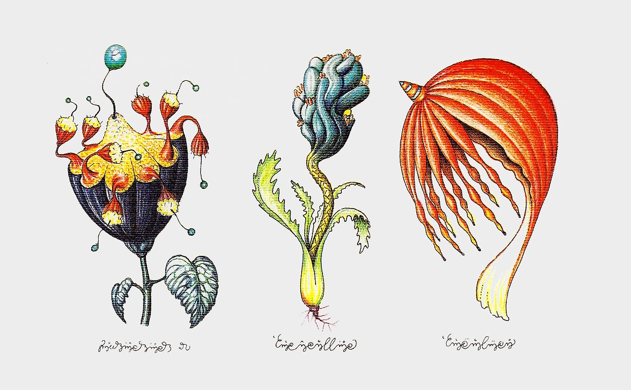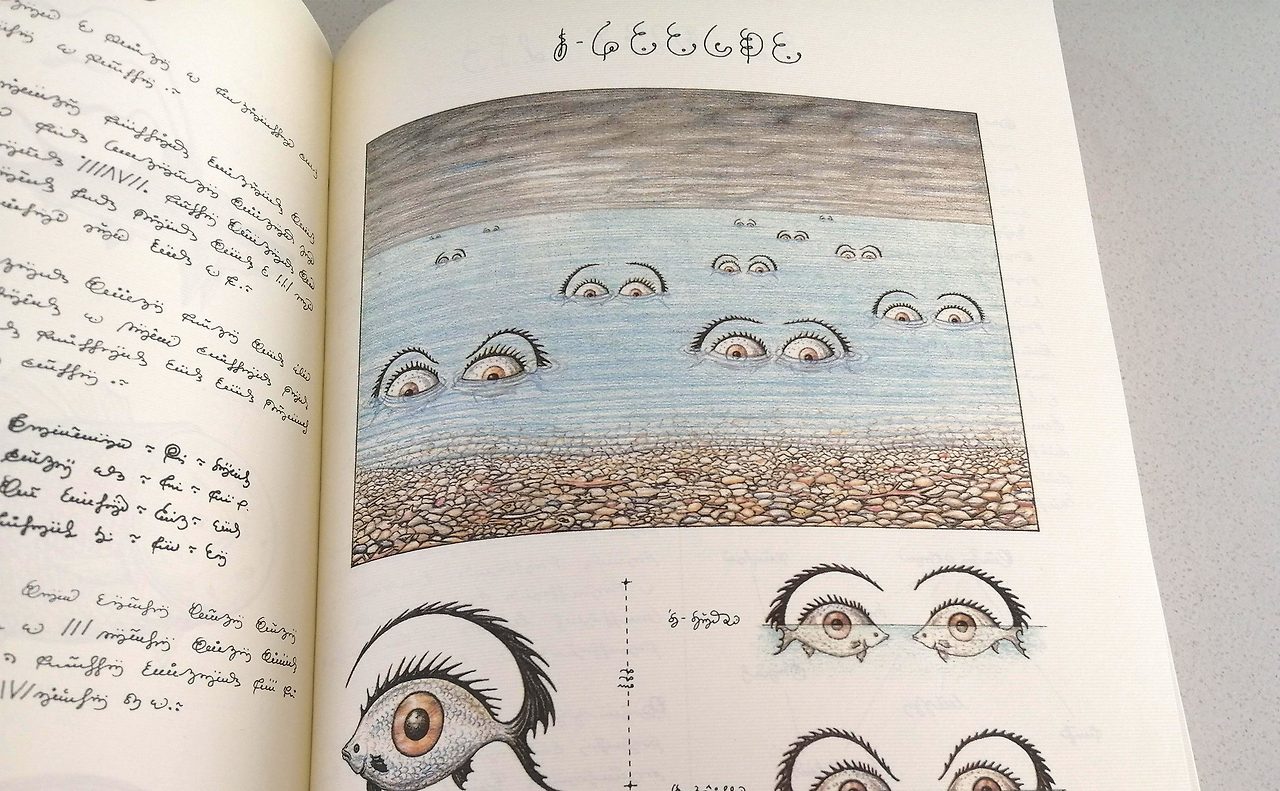 이러한 작품 중에서도 특히 눈에 띄는 것이 바로 루이지 세라피니Luigi Serafini가 1970년대 후반에 작성한 상상의 세계에 대한 그림 백과사전 《코덱스 세라피누스Codex Seraphinianus》입니다. 이 책에는 알 수 없는 언어로 쓰인 텍스트와 기괴한 그림으로 가득 차 있습니다.