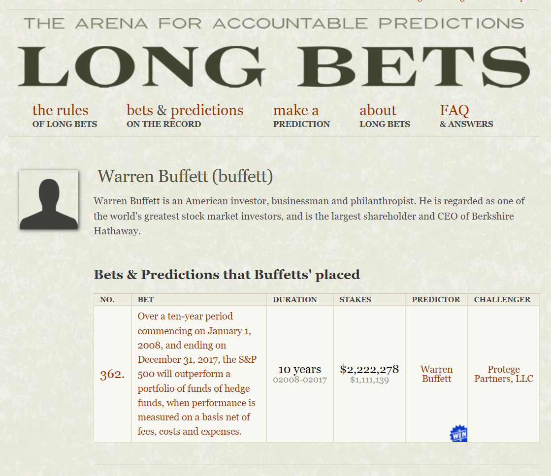 2007년 워렌 버핏은 롱벳(Longbet)이라는 기부시스템(내기에 패배한 상대방이 자선단체에 기부를 하는 시스템)을 통해 사모펀드인 'protege partners' 와 내기 대결을 벌였습니다. 워렌 퍼빗은 자산운용사 뱅가드의 S&P500 ETF(VOO)를 선택하였고, 'protege partners'는 헤지펀드(5개)를 선택하였습니다. 이후, 2008년 1월 1일부터 2017년 12월 31일까지 10년간의 투자성과를 비교하였고, 결과는 압도적인 워렌 버핏의 승리였습니다. (선택된 해지펀드의 10년 (누적)수익률은 약 36%를 기록했고, VOO의 수익률은 약 126%를 기록하였습니다.)