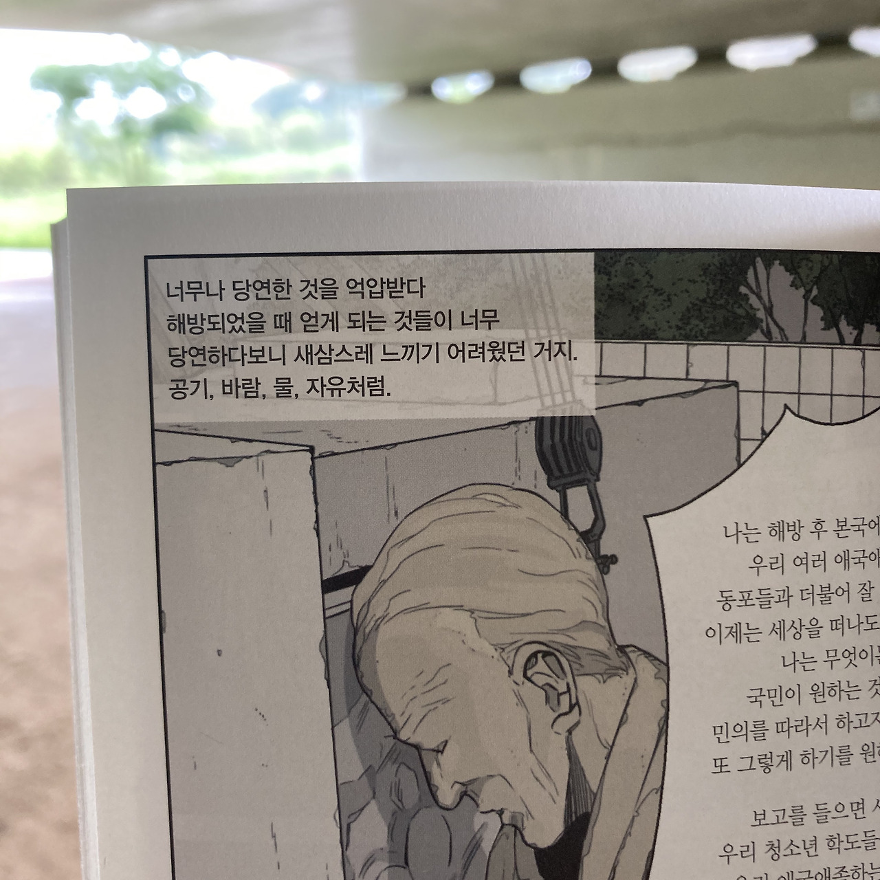주인공은 젊은 시절의 자신을 회상하며, ‘생존’을 위해 ‘외면’을 선택해온 시간들을 후회한다. 거리에 서 있는 그들과 함께하지 못했다는 미안함에 사경을 헤매는 순간에도 투쟁에 참여했던 친구들의 이름을 찾는 안타까운 모습을 보여준다.