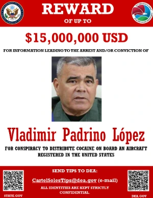 미국은 2020년 파드리노를 마약 밀매 공모 혐의로 기소했습니다. 코카인 운송 항공기에 6만 달러 이상의 보호비를 청구하고, 돈을 안 내면 베네수엘라 군으로 파괴했다는 혐의입니다. 이 돈으로 베네수엘라 정치 자금을 댔다고도 합니다. 미국 국무부는 1,500만 달러 현상금을 걸고 "파드리노를 베네수엘라 정부 장관으로 인정하지 않는다"고 공식 발표했습니다.