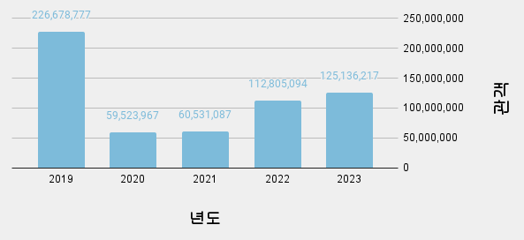 그래프에서 명확하게 보이는 것처럼 2021년까지 국내 관객수는 전혀 반등하지 못했다. 하지만 2022년 5월에 개봉한 <범죄도시2>가 정말 오랜만에 1,000만 영화에 등극하더니 6월 <탑건: 매버릭>, 7월 <한산: 용의 출현>, 12월 <아바타: 물의 길>이 연달아 준수한 성과를 올리며 박스오피스는 3년 만에 반등에 성공한다. 이후 2023년 <서울의 봄>과 <범죄도시3>가 1,000만 관객을 달성하고 전체 관객수도 2022년에 비해 소폭 상승하며 관객들의 발걸음은 코로나 때에 비하면 영화관으로 조금씩 돌아오고 있는 모양새다.