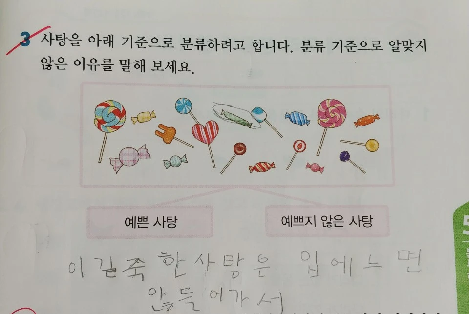 윗 아이들의 답변처럼 큰 사탕이 입에 들어가지 않을 수도 있고, 자로 재어보면 기분이 좋을 수도 있다. 잘 생각해보면 틀린 답도 아니다. 그래서 더욱 자기가 생각하는 걸 솔직하게 표현하는 아이들에게 매력을 느끼는 것 같다.