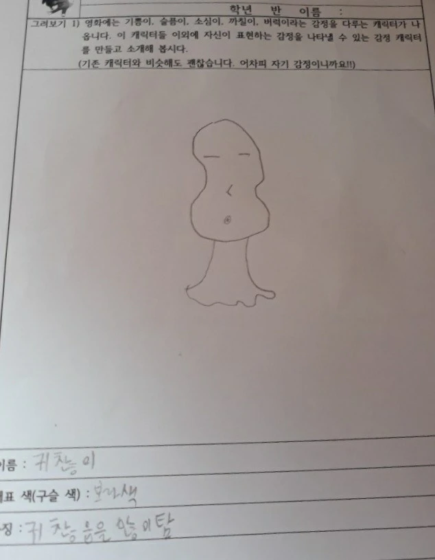 숙제를 읽으면서도 재미있는 일은 참 많다. 하루는 창의적 체험 활동 시간에 영화 인사이드 아웃을 간략하게 요약하는 영상을 보여주었다. 그리고 자신만의 감정 캐릭터를 그려보라고 했다. 어떤 아이가 3분 만에 뚝딱 마무리하고 손을 들었다. 그림만 보고는 바로 '더 자세히 그려야 될 것 같네'라고 말하려 했다. 하지만 밑의 이름을 보는 순간 웃음을 참지 못했다.