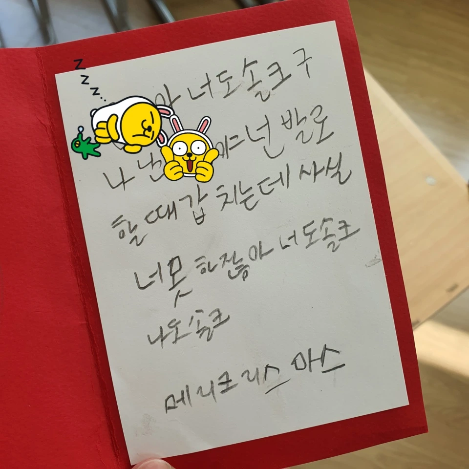 읽어보면 개연성도 없고, 무슨 말을 하고 싶어 하는지도 모르겠다. (확실한 건, 국어 시간에 배운 편지 형식을 하나도 제대로 갖추지 않았다..^^). 그런데 뭔가 모르게 웃기다. 고마운 친구에게 써보라고 했더니 자기가 게임을 더 잘한다고 말하는 것도 웃기고, 고작 11살이 '솔로 크리스마스'라고 인사하는 것도 웃기다.