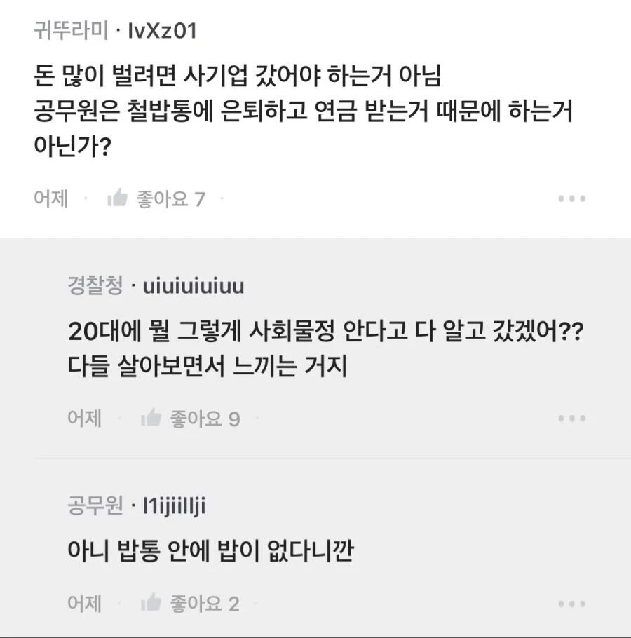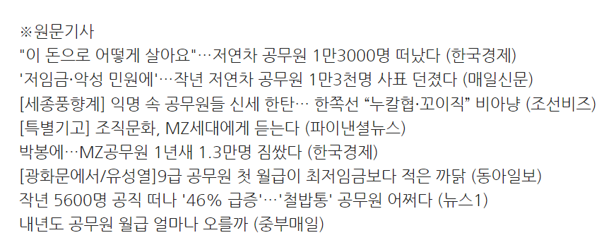 뉴스를 봤다. MZ 공무원들이 23년도가 되어 의원면직(퇴사) 율이 높아졌다는 내용이었다. 낮은 임금에, 높은 민원과 업무량에 버티지 못한 저연차 공무원이 퇴사를 결정한 셈이다. 스크롤을 내렸지만, '너희 말고도 할 사람이 많으니 어서 나가라는 내용'이 베스트 댓글이었다. 우리의 상황이 더 나아질 이유는 없었다. 아무도 원하는 사람이 없었기에.