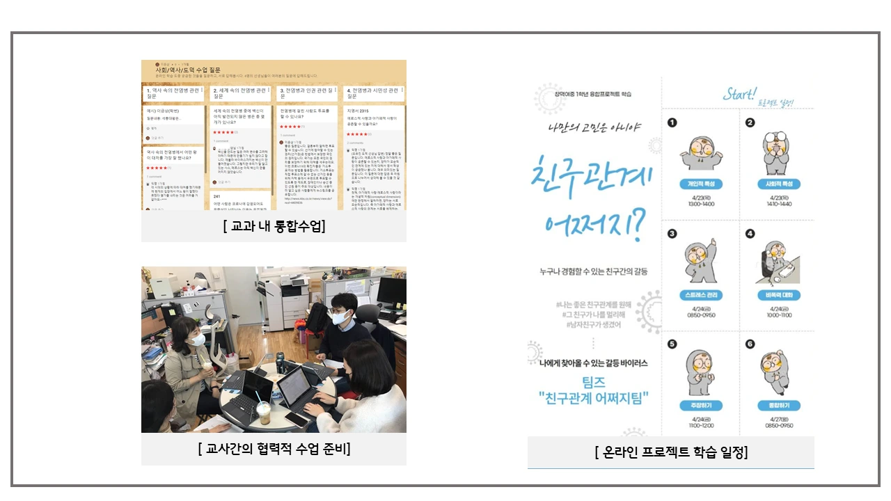 교사는 원격수업을 시작하며 같은 교과 선생님들과 협업을 통해 통합수업을 진행했습니다. 교사들은 하나의 현상에 대해 깊이 있게 대화를 나눴고, 각 과목에서 다룬 세부 질문과 자료를 선정했습니다. 이러한 교사 간 협력적 수업 준비와 실행은 여기서 그치지 않고, 다양한 형태로 발전하였습니다. 여러 교과의 선생님들이 하나의 수업에 함께 들어가서 실시간 화상 수업을 진행하기도 했습니다. 학생들은 선생님들의 협력적 수업이 하나의 주제를 깊이 있게 이해하는 데 도움이 되었다고 말합니다. 선생님들의 협력 그 자체가 자신들의 과제 수행에 긍정적인 영향을 미쳤다고도 말합니다. 선생님들 역시, 동료들과 협력할 수 있는 시간을 확보하고, 수업에 집중할 수 있어서 좋았다고 말합니다. 코로나 19 이후에도 가능할 것인지에 대해서는 장담할 수 없습니다.