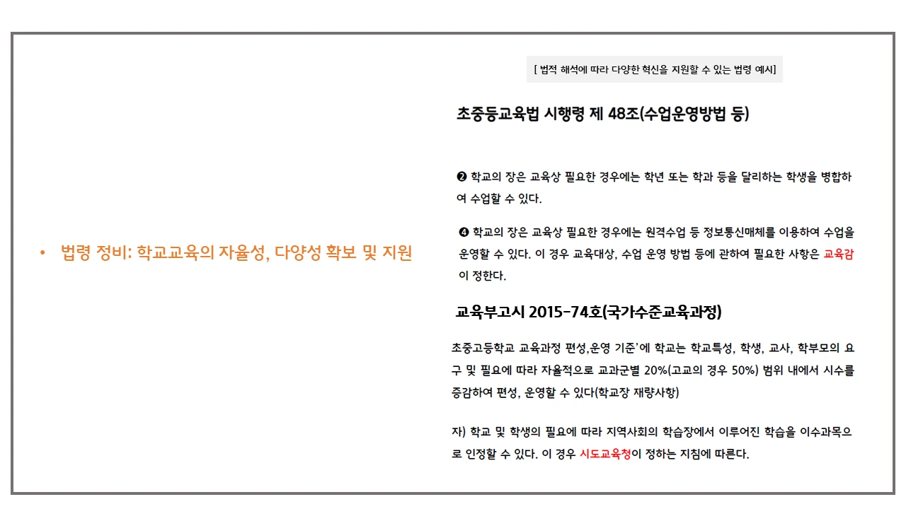 둘째, 미래교육을 위한 총체적인 법령 정비가 필요합니다. 법률, 시행령, 훈령, 고시뿐만 아니라 각 시도 교육청의 지침 등이 미래교육적 상상과 실천의 발목을 잡는 경우가 많습니다. 미래교육적 구호를 외치고 있지만 공식적 행위를 유도하는 법적 환경은 여전히 안정적인 행위에 머물도록 합니다. 예를 들어, 이번 원격수업의 경우만 해도 교육부, 교육청, 학교의 권한에 대한 법적 해석이 달라 과도한 논쟁이 발생하기도 했습니다. 출석과 평가 인정 범위 등도 원격수업 상황에서 명확하게 해결되지 않은 부분입니다. 현장의 혼란을 줄이기 위해 보수적인 법령해석이 필요한 부분도 있지만 학교의 자율권을 인정하고, 과감한 혁신을 허용하는 법령 정비도 필요합니다. 언제, 어디서나, 개별화된 학습, 지역사회 자원을 활용하는 학습을 진행하는 형태로 원격수업의 논의가 확장되어야 합니다. 단순히, 학교 안에서의 인프라 구축 논의로 축소되는 것은 십수 년 전의 논의로 회귀하는 것에 불과합니다.