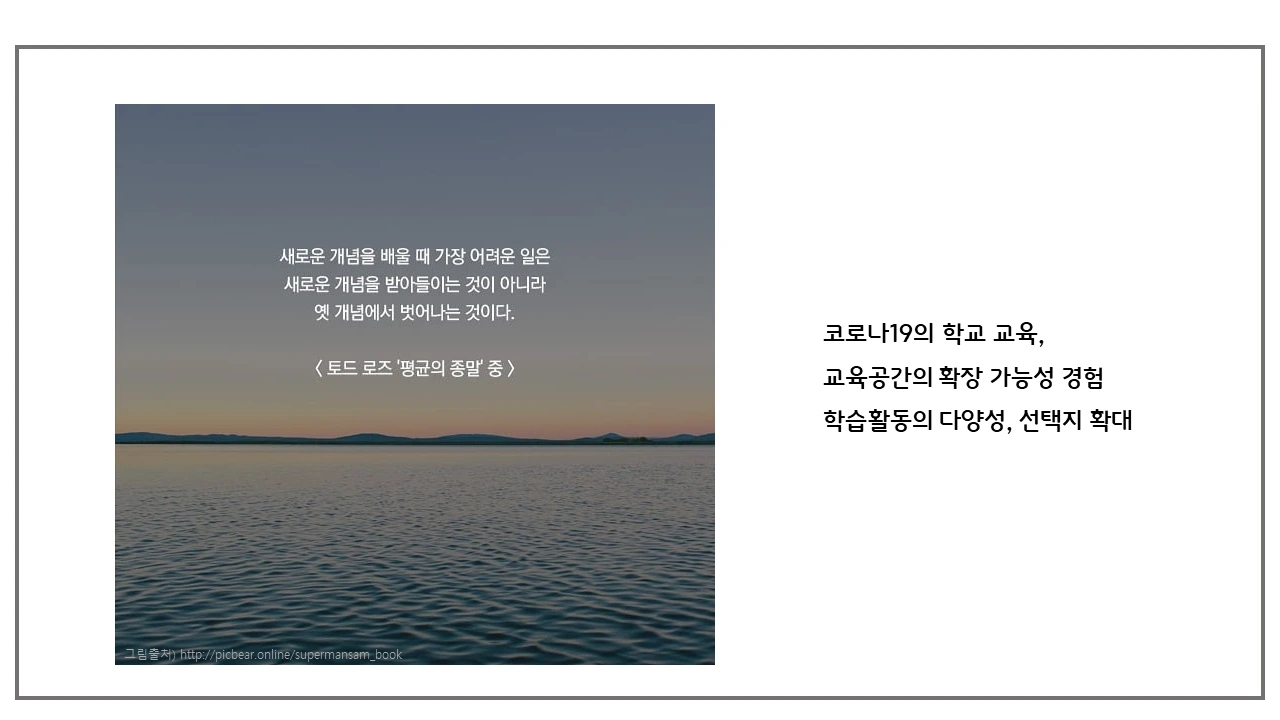 평균의 종말을 쓴 토드 로즈는 "새로운 개념을 배울 때 가장 어려운 일은 새로운 개념을 받아들이는 것이 아니라 옛 개념에서 벗어나는 것이다"라고 했습니다. 비정상인 것을 정상으로 받아들인 ‘뉴노멀’시대에 살고 있는 현재, 한국 교육은 잠시나마 옛 개념의 학교교육에서 벗어난 경험을 했습니다. 물론, 여전히 과거의 학교 개념에서 현재 상황을 받아들임으로써 어려움과 갈등을 겪는 경우도 있습니다. 자의든 타의든 간에 코로나 19와 같이 기존의 학교 개념을 벗어나게 만드는 상황은 다시 올 것입니다. 우리나라의 질병관리와 방역이 세계 최고 수준으로 칭송받는 것처럼 우리의 학교교육 시스템이 변화되기를 진심으로 바라고, 응원합니다.