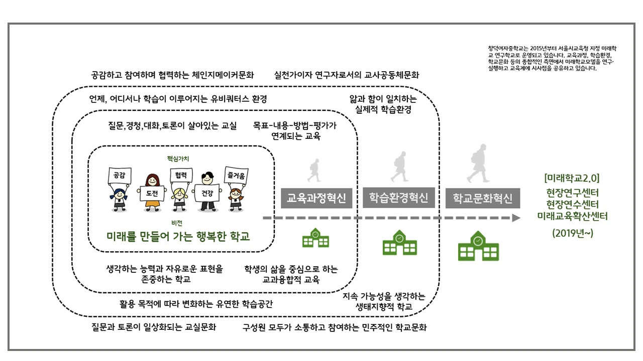 창덕여중은 2015년부터 미래학교 연구학교 사업을 진행하고 있습니다. 무엇이 미래교육이어야 하는지조차 합의되지 않은 상태에서 가장 교육적인 것은 무엇인가에 대한 연구를 하고, 협업을 하고, 실행을 하는 학교였습니다. 미래학교를 만들어 가는 일은 공간의 변화, 에듀테크의 도입만으로 이뤄진 것은 아닙니다. 가장 교육적인 행위가 일어나는 학교가 되기 위해 학교문화와 교육과정은 어떠해야 하는지를 끊임없이 질문하고 토론하고 도전했습니다.