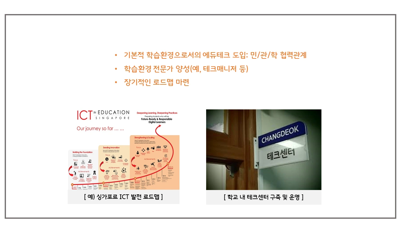 우선, 에듀테크는 학교의 기본적인 학습환경으로서 도입되어야 합니다. 아이들에게 가장 좋은 에듀테크 학습환경을 경험하게 하는 것은 미래사회를 위한 합리적 투자입니다. 무선인터넷과 기기 활용은 기본적인 학습환경이 되어야 합니다. 원격수업을 지원하는 에듀테크의 활용은 하나의 학습환경이며 학습효과에 큰 영향을 미칩니다. 에듀테크의 선정, 준비, 활용, 유지관리는 교육적 전문성을 요하는 일입니다. 즉, 에듀테크를 단순히 기술적으로만 접근할 것이 아니라 교육적으로 접근하는 전문가 양성이 시급합니다. 실제, 일부 선진국의 미래학교에서는 테크 매니저들이 비중 있는 역할을 하고 있습니다.