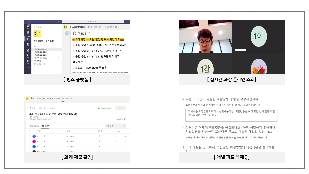 오전 8시 30분, E교사는 학교에서 사용하고 있는 팀즈 플랫폼(MS)의 학급 채널에서 실시간 화상 조회로 하루를 시작합니다. 3년 동안 사용한 플랫폼이기에 E교사에게는 어느 정도 익숙합니다. 온라인 조회가 끝나면, 교사는 팀즈 플랫폼에서 과제를 확인합니다. 학생들이 전날 제출한 과제를 확인하고 개별적으로 피드백을 제공합니다. 거의 반나절은 이러한 피드백으로 시간을 보냅니다. 과제를 제출하지 않은 학생들에게 개별적으로 연락을 하고, 원인을 찾고 독려하기도 합니다. 오프라인에서 수업에 적극적으로 참여하지 않는 아이들을 지도하듯, 온라인 상황에서도 유사한 행위가 나타납니다. 동료들과 대화를 해보면, 이러한 행위들이 결코 쉬운 것은 아닙니다. 그러나 행정업무, 생활지도 부담이 줄어든 상황에서 교사는 학습지도에 집중하게 된 것도 사실입니다. 또한, 온라인 상황에서 수업은 더 이상 폐쇄적인 행위가 아닙니다. 동료 교사뿐만 아니라 학부모들도 교사의 수업을 참관할 수 있습니다.