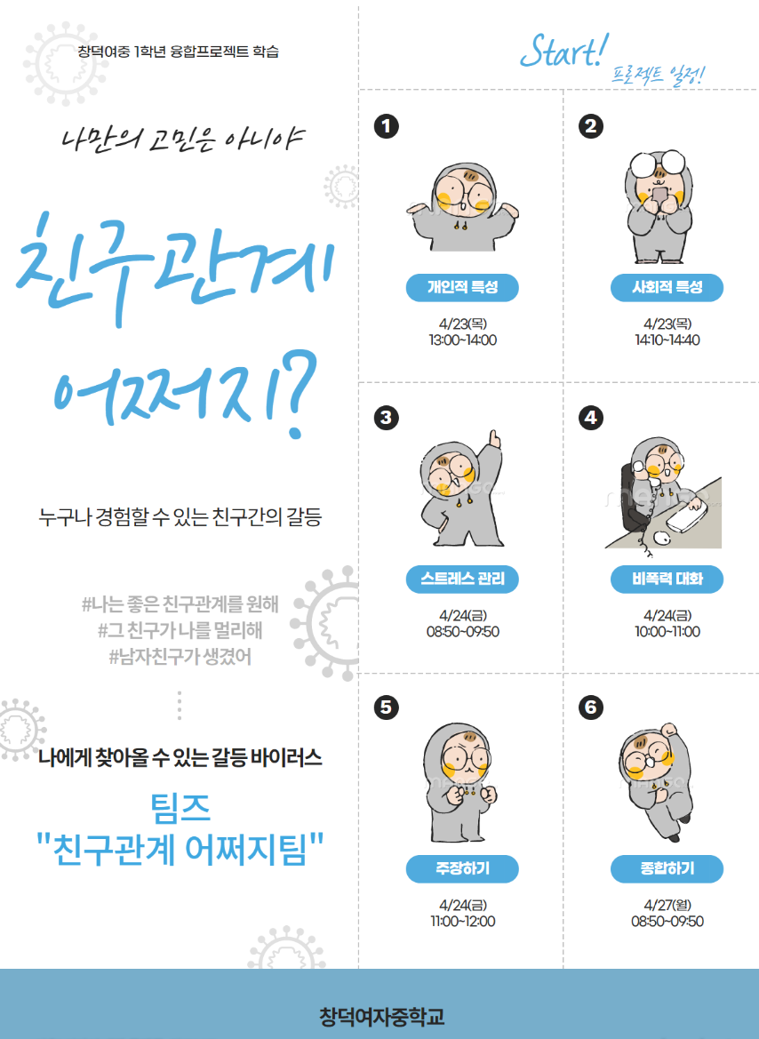 이번 프로젝트의 주제는 '친구관계 어쩌지 프로젝트는 총 일곱 시간에 걸쳐서 학생들이 교우 관계에서 겪는 갈등을 현명하게 해결해나가는 방법을 탐구하도록 합니다. 먼저 가상의 갈등 상황을 중심으로, 수학의 인수분해 원리를 적용하여 개인의 특성을 분석하고, 사회적 관계에서 역할과 지위로 인한 갈등 관계를 이해했습니다. 그리고 스트레스가 가져오는 다양한 신체적인 변화와 스트레스 해소 방안에 대해 의견을 나누고, 이런 갈등을 원만하게 해결하기 위한 비폭력 대화법과 함께 성행동 관련 갈등 상황에서 자신의 주장을 펼치는 방법에 대해 공부하고 이를 적용하여 가상 인물에 대한 상담일지 작성을 진행했습니다.