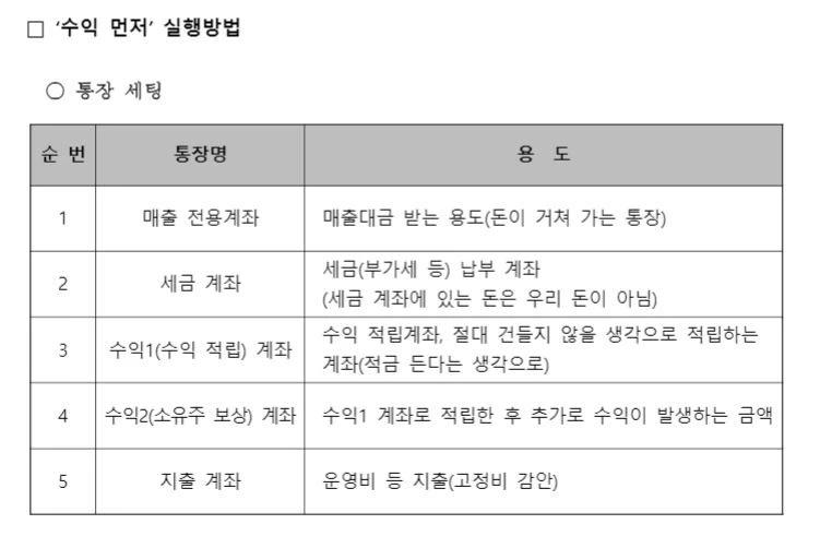 통장 5개를 구분해 만들어 놓은 뒤 발생하는 매출을 규모에 맞게 운영하는 방식을 적용하고 있는데요.