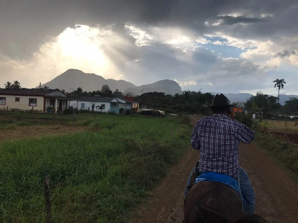쿠바 비냘레스에 가면 말을 많이 탄다. 그래서 이왕 온 거 내 인생 처음 말타기에 도전해봤다. 픽업 택시를 타고 말 주인집에 도착해서 말을 타고 출발. 미리 말 탈 준비를 한다고 긴바지를 입고 왔던 터라 뭐 그냥 타면 되지 어렵나 싶었다. 근데 타면 탈 수록 왜 이렇게 불편하지? 다리가 꼬이는 듯한 불편함을 감수하며 15분 정도 말을 타고 도착한 곳은 시가 농장이었다.