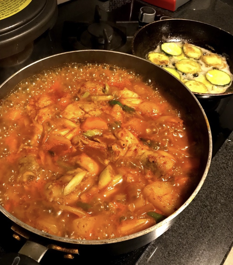 다음 날, 살사 그룹레슨을 다녀와서 저녁 준비하느라 바빴다. 닭볶음탕에 혹시나 매운 음식 못 먹을까 봐 수동이를 위한 호박전까지! 나 이거 참. 친구들이랑 술 마시러 전집 가는 것도 너무 싫어하는데 외국 나와서는 호박전을 수시로 부치는 나.