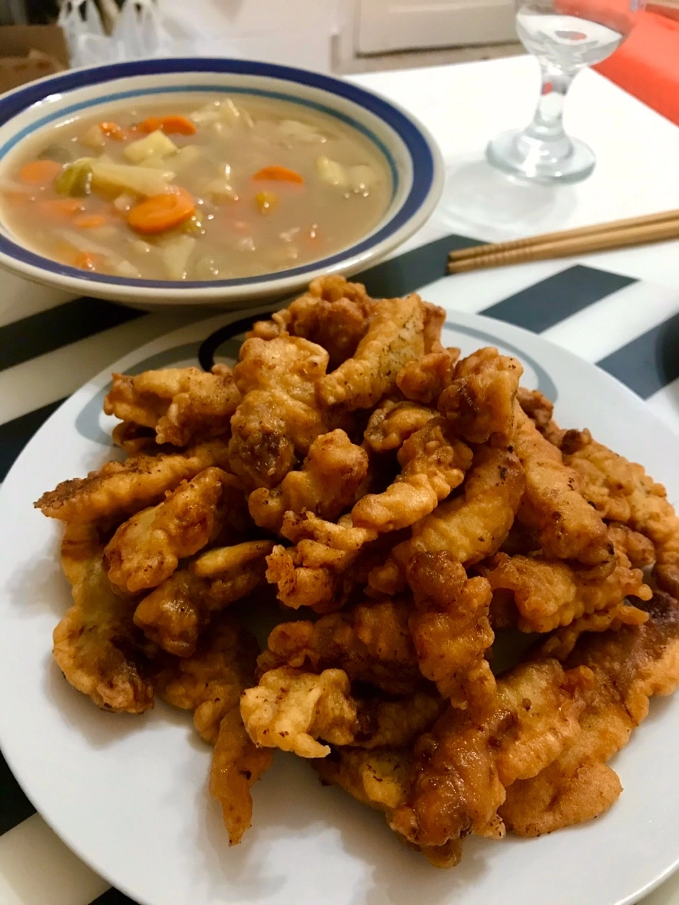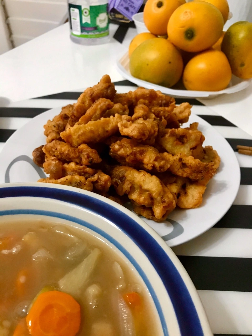 저녁은 고기반찬. 나눔 받은 돼지고기로 만든 탕수육. 튀김옷 만들어 튀기고 기름 빼고 탕수육 소스 만들어 찍먹으로 먹으면 된다.