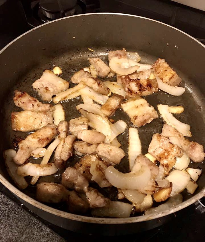 “삼겹살에 양파 마늘 넣고 굽고 소금 찍어 먹어.”