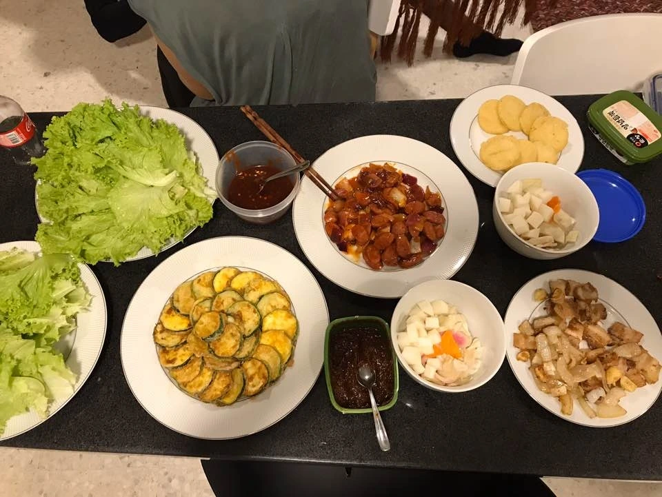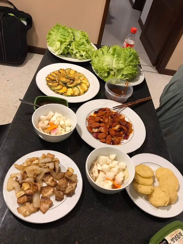소시지 야채볶음과 전은 미리 해두고 삼겹살은 초벌로 좀 구운 후에 친구들이 왔을 때 다시 구웠다. 혼자 다 하려니 너무 힘들었는데 그래도 페르난다가 도와줘서 한시름 덜었다.
