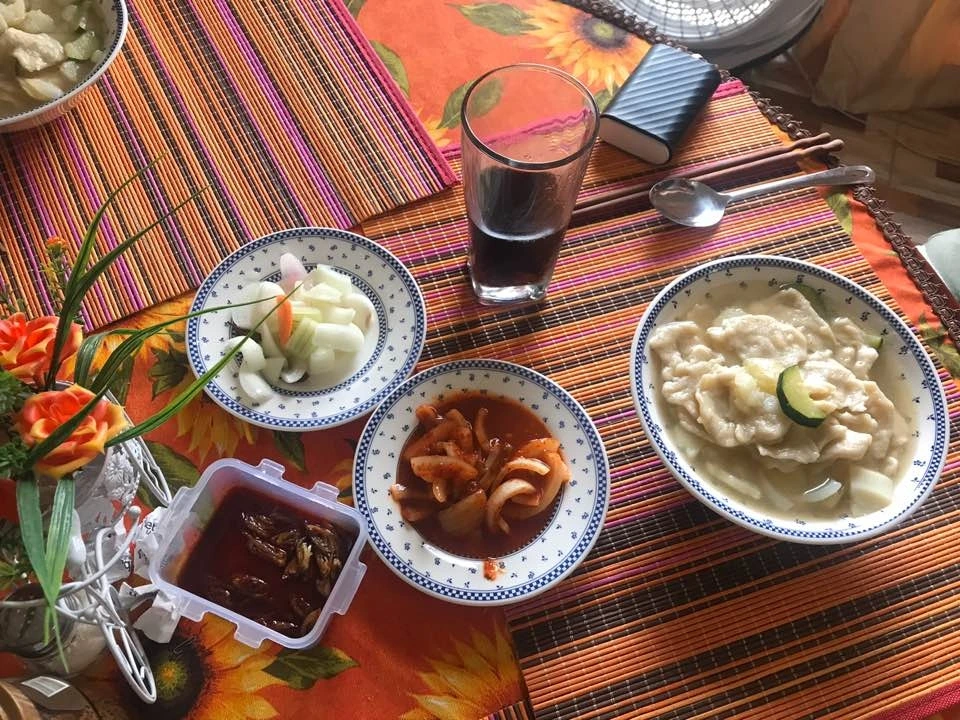 다음날에는 드디어 카린이를 우리 집에 초대했다. 항상 누굴 초대하면 밥상에 삼겹살이나 고기가 올라가기에 채식주의자인 카린이를 한 번도 초대하지 못해 마음에 계속 걸렸었는데 떠나기 전날이 되어서야 드디어 초대할 수 있었다. 오늘의 메뉴는 수제비. 다 같이 힘을 합쳐 수제비 반죽을 떼어내니 금방 끝났다. 보글보글 감자와 함께 끓여 맛있는 수제비 완성. 김치가 없어 김칫국물에 양파를 담가 둔 것을 꺼냈다. 떠날 날이 얼마 안 남아 김치를 새로 담그기 어려워 남은 김칫국물에 양파만 넣어뒀는데 이럴 수가. 카린이가 숟가락으로 김칫국물까지 다 떠먹네??!!