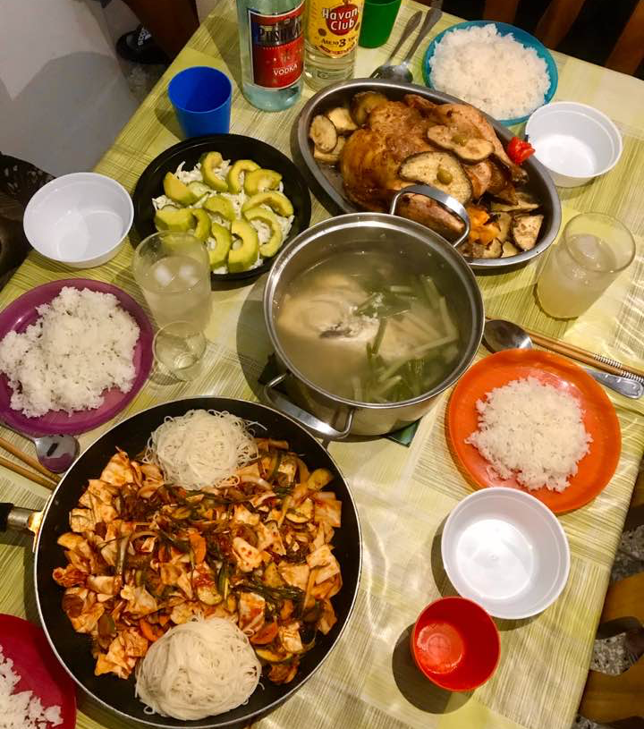 오늘의 메뉴는 골뱅이 소면과 지리탕 그리고 치킨 바비큐다. 골뱅이 소면과 지리는 재료는 내가 집에서 미리 준비해 가고 버무리고 요리하는 건 S네 집에서 하기로 했다. 통닭 바비큐는 S가 쿠바 친구를 통해 오븐에 구워올 예정. 그렇게 우린 뚝딱뚝딱 요리를 했고 그렇게 한 상이 완성되었다. 통닭은 속이 덜 익어서 해체 후 한 번 더 익혔다. 지리는 무가 없었지만 그래도 신선한 생선이라 그런지 시원한 맛이 꽤 괜찮았다.
