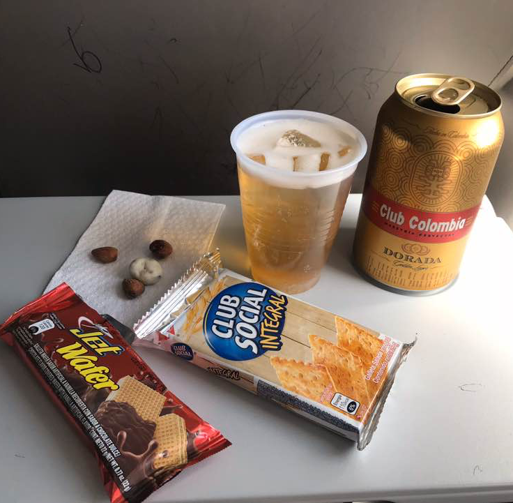 항공기는 곧 출발했고 추가 비용으로 사 먹을 수 있는 간식 및 기내식 제공 시간이 다가왔다. 아까 신세를 진 아빠와 딸에게 뭐라도 사주고 싶어서 다가갔다. 한사코 괜찮다고 하는 아빠. 그럼 딸아이에게 줄 망고주스만이라도 받아달라며 주스 하나를 얼른 사서 드리고 왔다. 나중에 보니 그는 가장 비싼 기내식 세트를 먹고 있더라는. 난 마지막으로 콜롬비아 맥주와 인사를 하고 싶어 남은 콜롬비아 돈으로 맥주와 주전부리를 샀다. 옆 옆자리 남자가 가방에서 주섬주섬 꺼내 미리 사온 땅콩 주전부리를 나에게 조금 건넸다. 먹거리 나눔 훈훈하네.