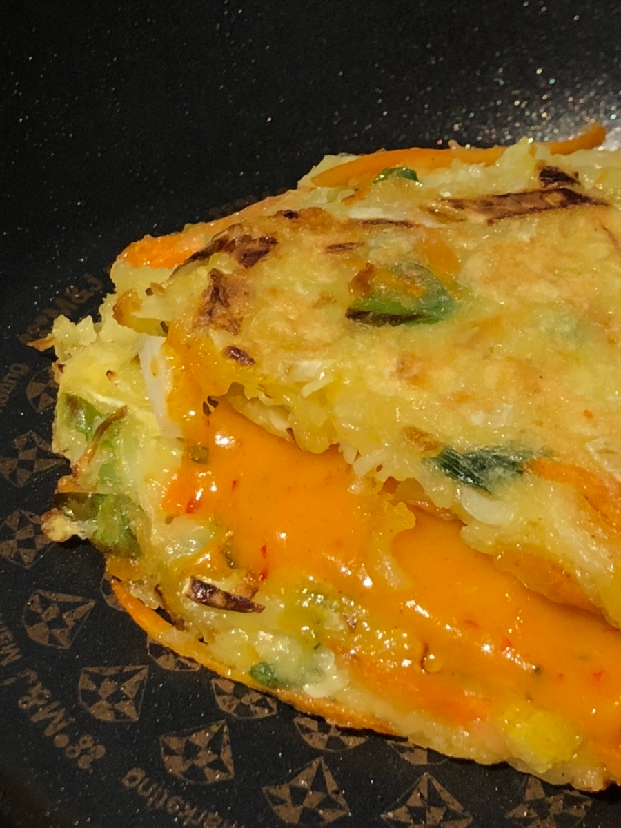 4. 반죽이 익으면 반으로 나누고 슬라이스 치즈를 얹은 뒤 다시 반으로 접어 치즈를 녹인다.