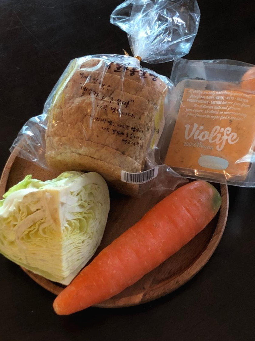 호밀식빵, 당근, 양배추, 파, 물, 부침가루, 카레가루, 소금, 비건 슬라이스 치즈, 케첩, 식물성 마요네즈, 설탕