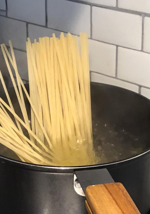 1. 팔팔 끓는 물에 소금 1스푼과 올리브유 한 스푼을 둘러주고 파스타면을 넣어 익힌다. 이때 팬에서 소스와 버무릴 것을 고려해 완전히 익히는 것보다는 살짝 덜 익혀주는 것이 좋다.